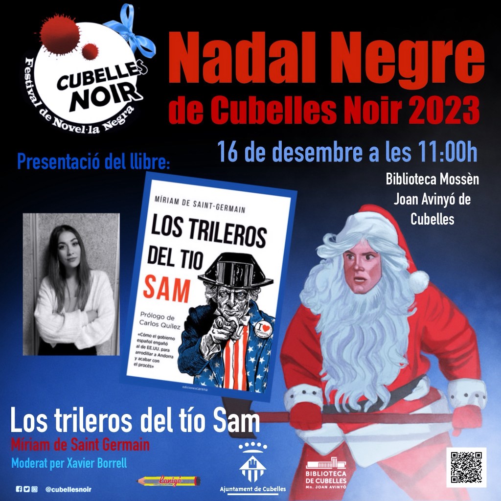 Nadal negre 2023. Ja tenim molt a prop el pròxim esdeveniment de Cubelles Noir amb el Nadal negre. Enguany tenim la participació de l’autora del llibre “Els trilers de l’Oncle Sam”, de Miriam Saint Germain, periodista especialitzada en crònica policial i de successos que col·labora com a redactora en el diari “El taquígraf” i del programa de TV3 “Tot es mou”.