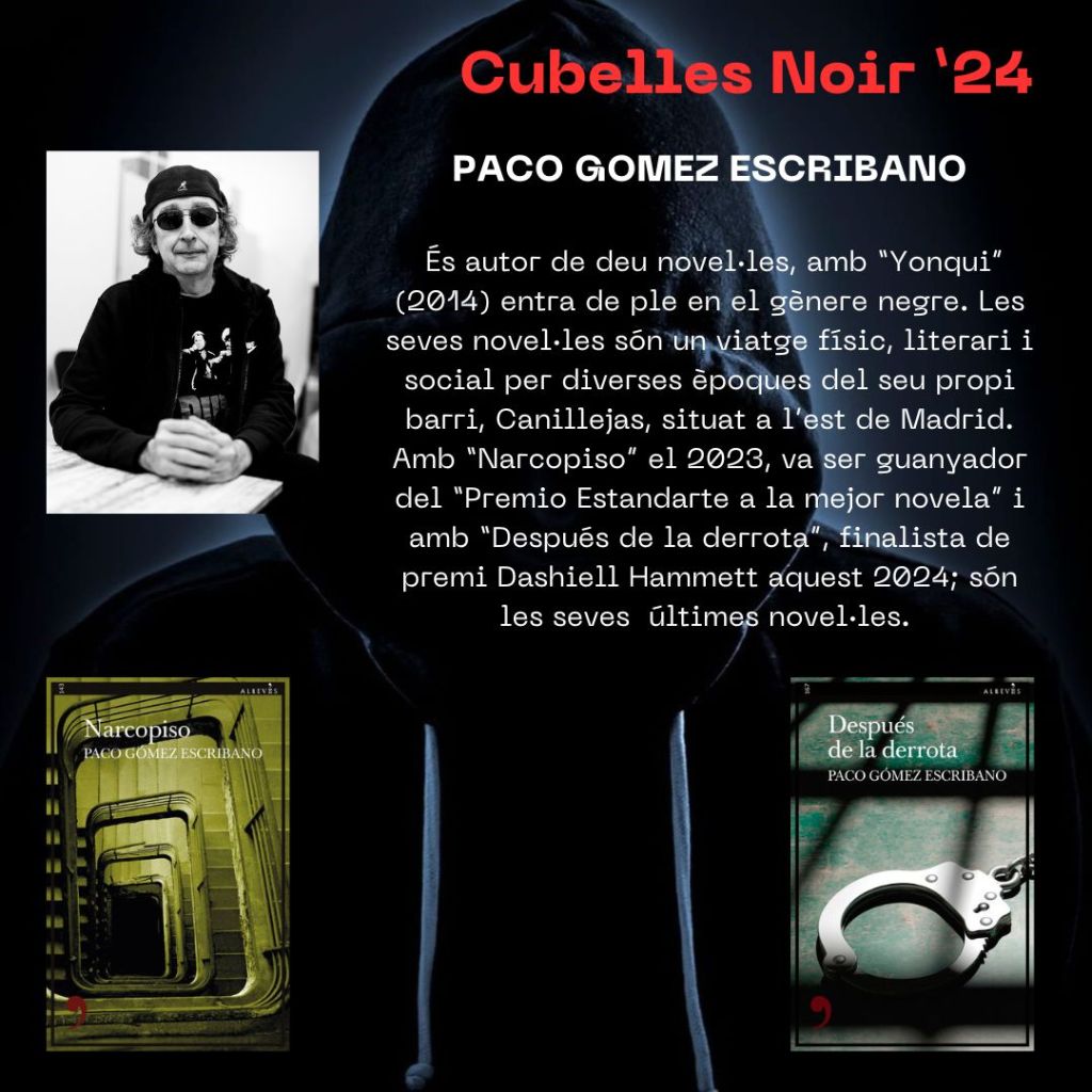 ajuntamentdecubelles, cubellesnoir, cubellesnoir24, garrafsona, novelanegra, novel·la negra Presentem a… Paco Gómez Escribano Publicat per cubellesnoir el 4 Agost, 20245 Agost, 2024 Presentem a… Paco Gómez Escribano. Aportarà la seva experiència i anècdotes a “Quan ningú ens feia cas, inicis de la novel·la negra”, el dissabte a la tarda. Comparte:Comparteix Feu clic per compartir a X (S'obre en una nova finestra) X Feu clic per compartir al Facebook (S'obre en una nova finestra) Facebook Feu clic per enviar un enllaç per correu electrònic a un amic (S'obre en una nova finestra) Correu electrònic Feu clic per compartir al Pinterest (S'obre en una nova finestra) Pinterest M'agrada S'està carregant... Relacionats