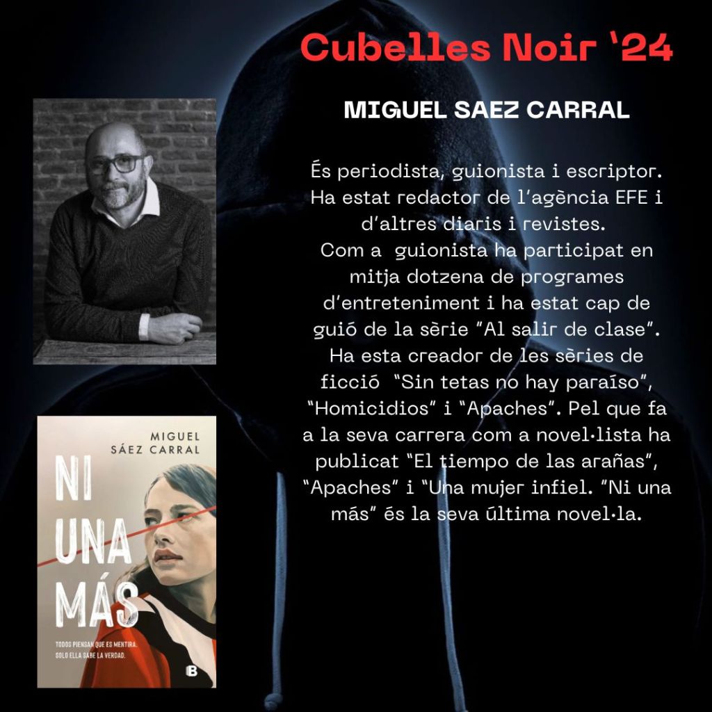 Presentem a… Miguel Sáez Carral. Veurem la projecció del primer capítol de “Ni una más” escrita per ell. A més a més, participarà a la taula rodona sobre ” Evolució del gènere: del llibre a la pantalla” i per últim ens farà una masterclass sobre “Com construir un thriller per televisió”.