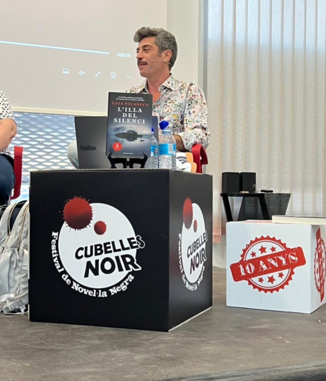Debat candidates al premi a Millor novel·la negra escrita per una dona en català en 2024, moderat per @josedemontfort amb Marta Boleda, Gemma Romeu i Anna Casamitjana #CubellesNoir #10anys #FestaNegra